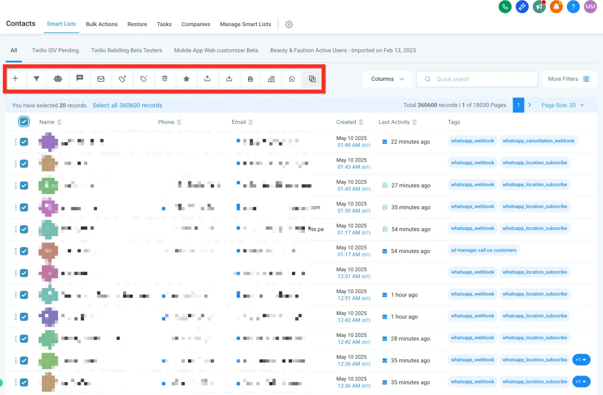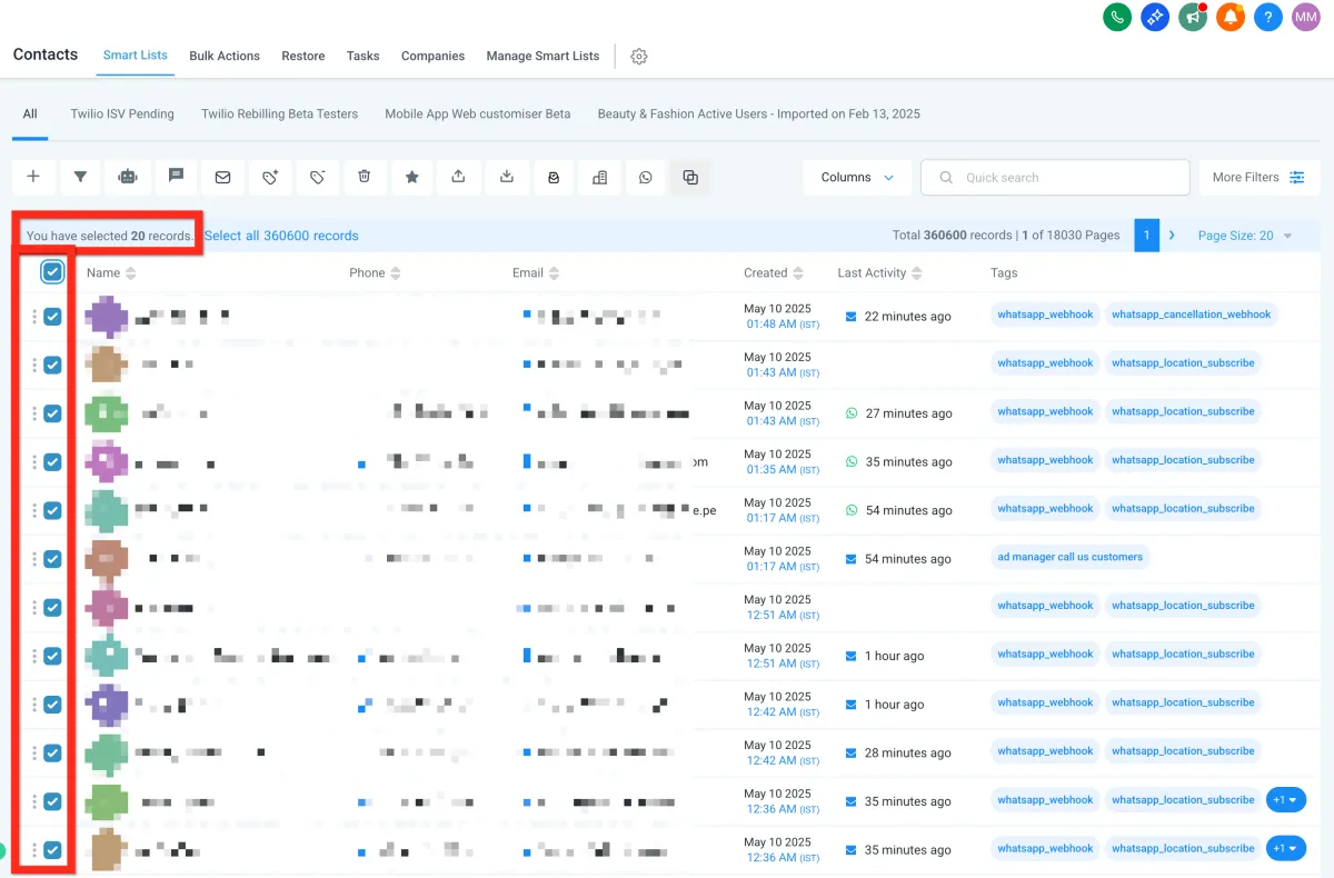 Choose your bulk action (email, SMS, etc.).