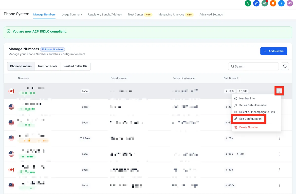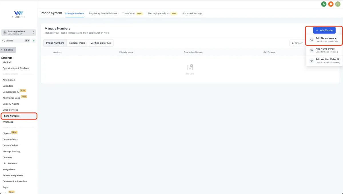 Navigate to Settings > Phone Numbers.